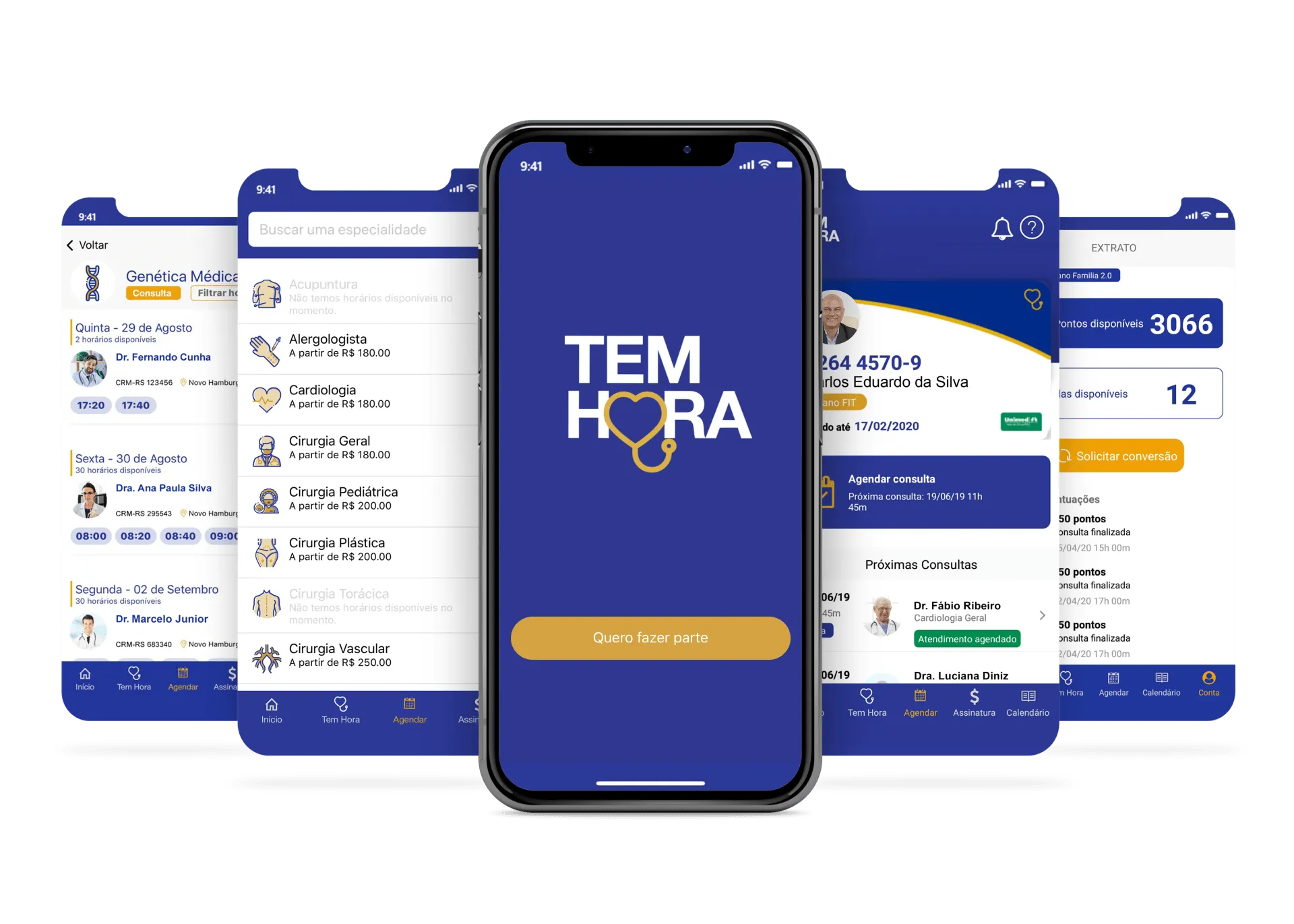 O Tem Hora é um aplicativo de agendamento de consultas, que oferece descontos para seus assinantes em consultas, exames, procedimentos de urgência e internações.